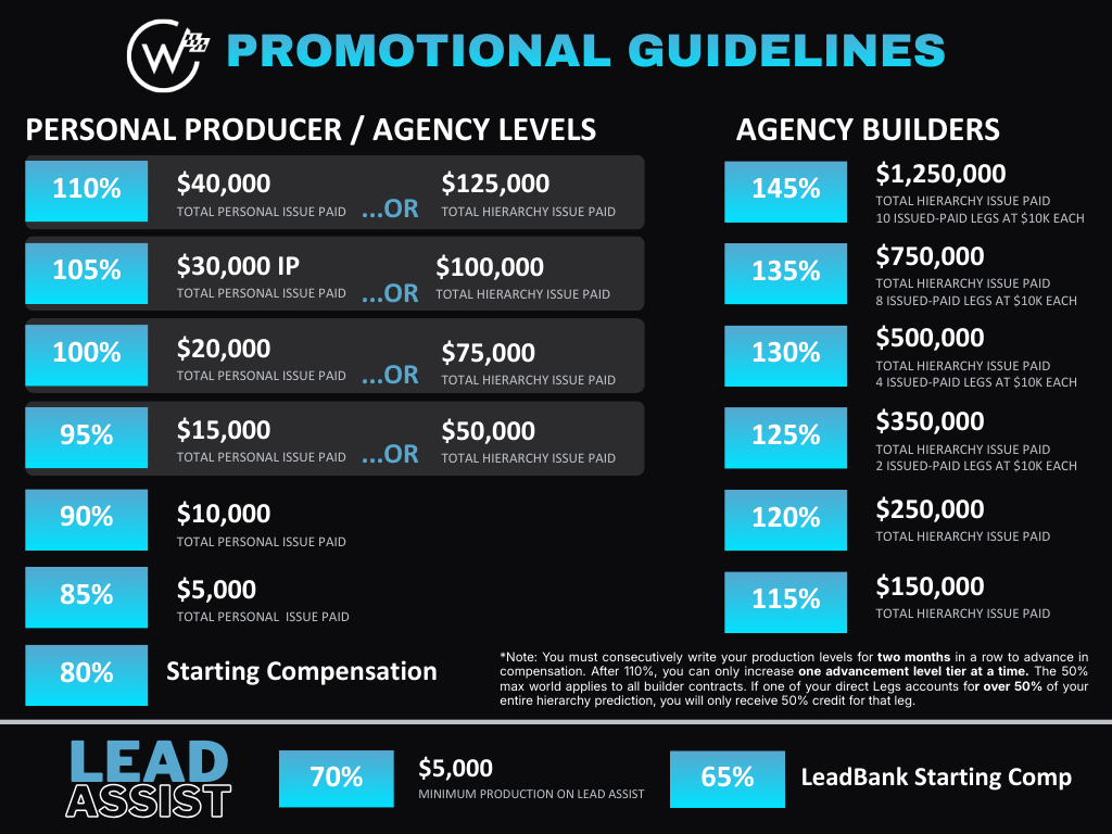 Note: You must hit production levels 2 months in a row to advance in commission levels. After reaching 110%, you can only advance one level at a time (5% Increase).